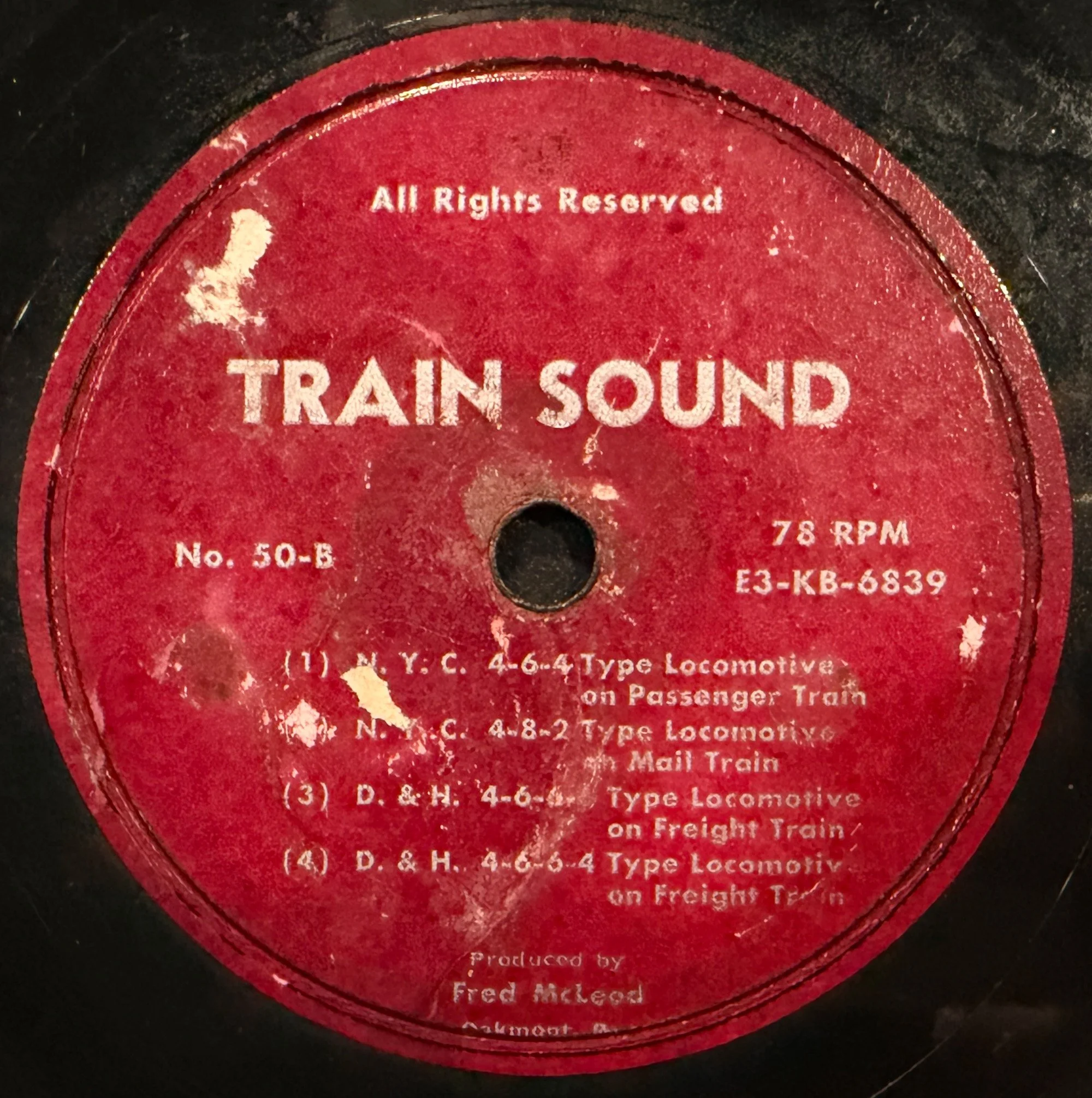 Above is the cover and labels for the “Authentic Railroad Sound Effects” record, released in 1952. When I first listened to this set, I got a bit confused because the title on the cover and the title of the records in my collection are different, yet the same recordings on contained on both versions. Hopefully I didn’t get this wrong, but it’s possible that the masters for these records were simply sold to a different company who re-released them. As stated in the episode, this set is the one William A. Steventon (of the Railroad Record Club) received as a Christmas gift from his wife. After hearing the recordings, Steventon was very disappointed because it was clear the contents of these records was all staged. If anything, “Authentic Train Sounds” showed Steventon how NOT to create a railroad sound effects record.