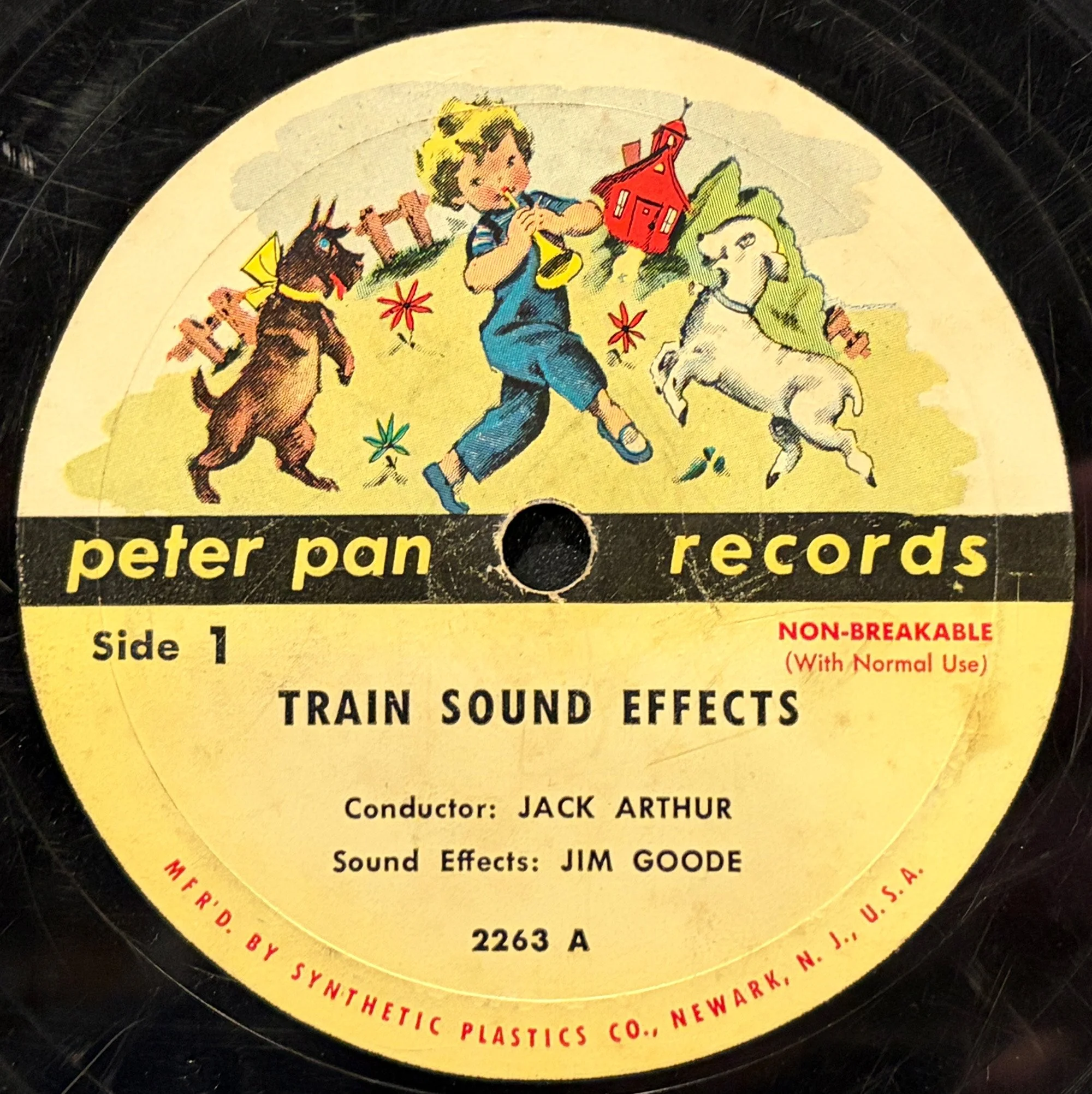 My favorite record out of the whole lot; “Train Sound Effects” released by Peter Pan Records sometime in late 40s or early 50s. What makes this record so charming for me is that it doesn’t pretend to be an authentic recording of an actual ride in a coach car while a conductor busily wanders up and down the isle assisting passengers and calling out the stops. This record was made solely for children. If anything, it helps to enhance a child’s imagination of what it would be like to take a trip on a train pulled by a steam engine as it makes its way down the Northeast Corridor to Grandma’s house. Imagine going from New York to Atlanta in 6 minutes! Wonderful stuff, for sure.